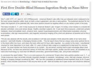 "We are very pleased with the results, and we believe it will help ease people's minds about the safety of our nano-silver products," said Keith Moeller, A Managing Director at ABL. "The full report shows that our unique nano-silver particle hits its apex in the blood within two hours, and clears the body within just 24 hours after ingestion. As a prelim to the study, I volunteered to be checked for silver deposition in my body, after 15+ years of almost daily usage as a supplement to help boost my immune system. No silver residue was found anywhere in my system."